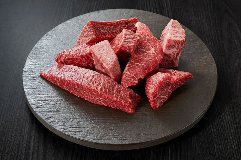 やわらかい部位や噛み込んでおいしい部位など、多種多様な部位をサイコロ状にカット。