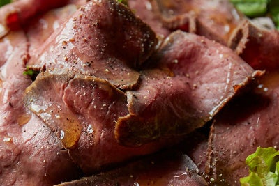 ローストビーフ(特上)の霜降りは、モミジ・ザブトンなどのとろけるだけでなく、味も香りも軽やかに感じる部位を焼き上げます。