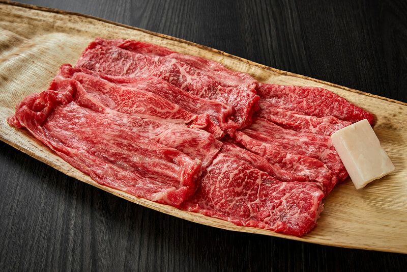 あっさりとした赤身のウチモモやソトモモ、味濃く香り高い霜降りの肩ロースをすき焼き用にスライス。