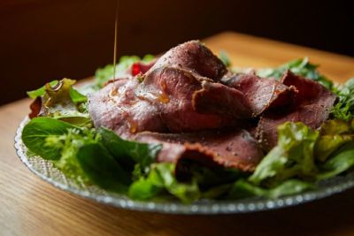 ローストビーフ(上)の赤身は、ウチモモ・カメノコ・ネクタイなど、すこし噛み応えはあるもものアッサリとした肉味を楽しめる部位を焼き上げます。