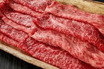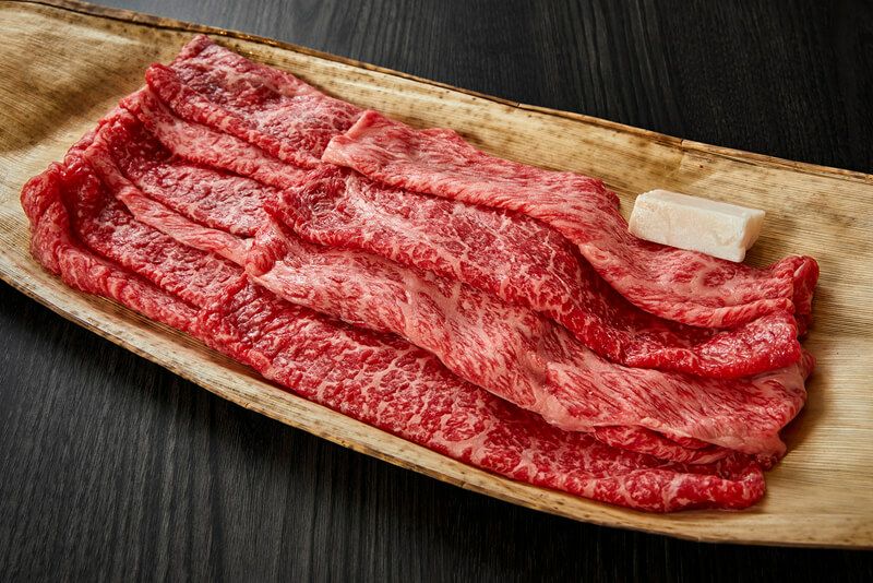 味濃く香り高い肩ロースを中心に味のバランスを整えるために少しあっさりめのロースといった霜降り部位と風味豊かで上品な味をもつウデやマル、あっさりとしたウチモモといった赤身部位をすき焼き用にスライスし、お客さまのご指定に合わせて取り合わせます。