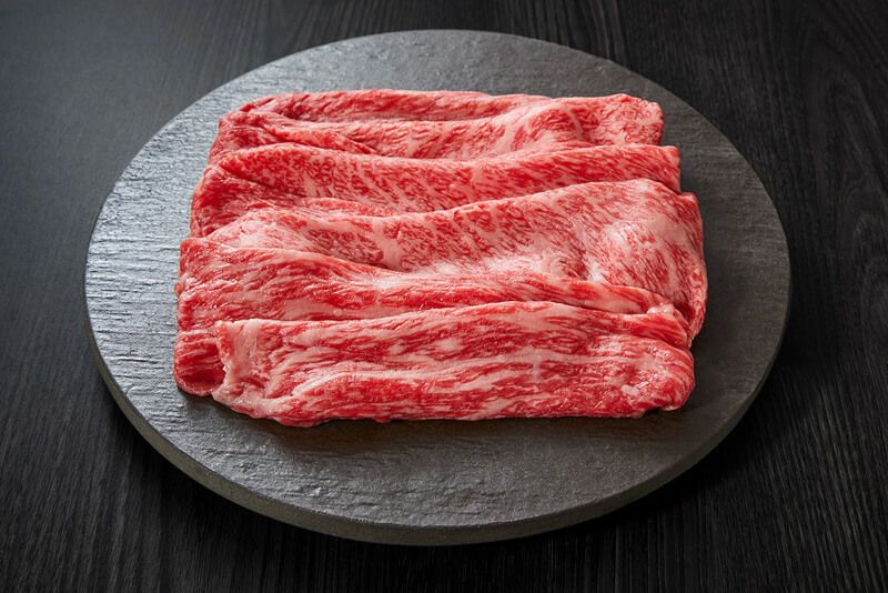 あっさりとしながらも出汁感のあるウチモモ、かろやかな肉味を持つソトモモ、とにかく味と風味の強いカメノコなどの赤身部位と噛み締めて口の中にうま味とあま味が広がる肩ロースやかろやかな風味を持つミスジなどの霜降り部位をしゃぶしゃぶ用にスライスし、バランスよく取りまとめました。