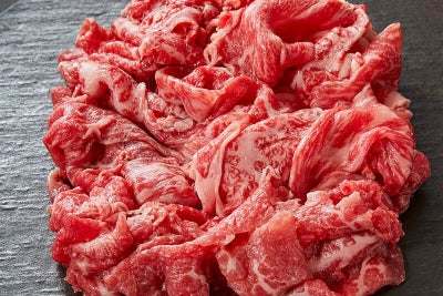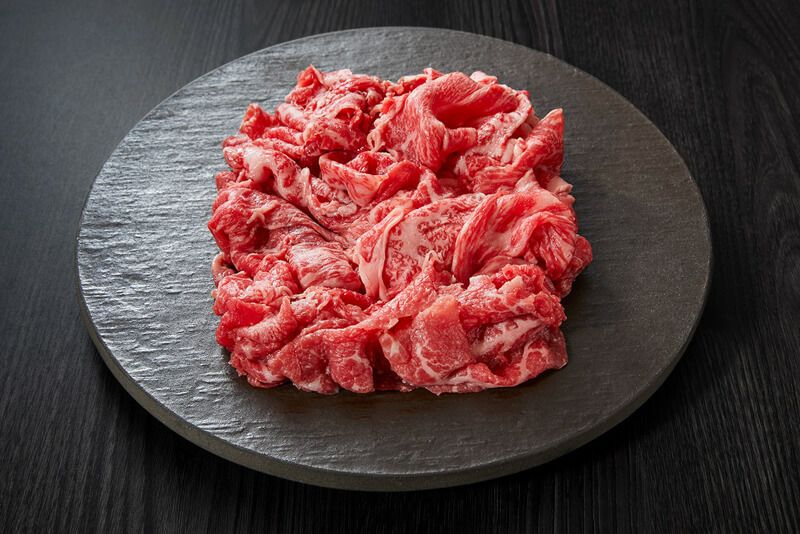 赤身から霜降りまでいろいろな部位を、混ぜ合わせ、しゃぶしゃぶ用に少し薄めの切り落としを作ります。
