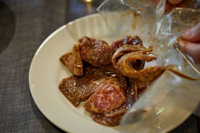 京中式熟成肉の牛焼肉を特製のタレで漬け込みました(100gあたり900円税別)