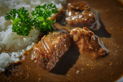 京中式熟成⽜⾁ の濃い⾁味、⾁⾹ 、⾷感、⾵味のバランスを最⼤限に活かしたビーフカレーです。