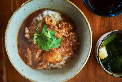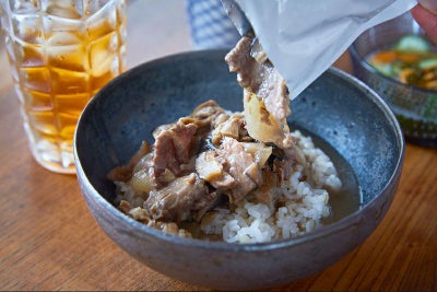 お肉の力強い味わいを牛丼の定番、醤油と砂糖とみりんで仕立てました。牛すじがより力強さを感じさせ、一味唐辛子がアクセントになっています。