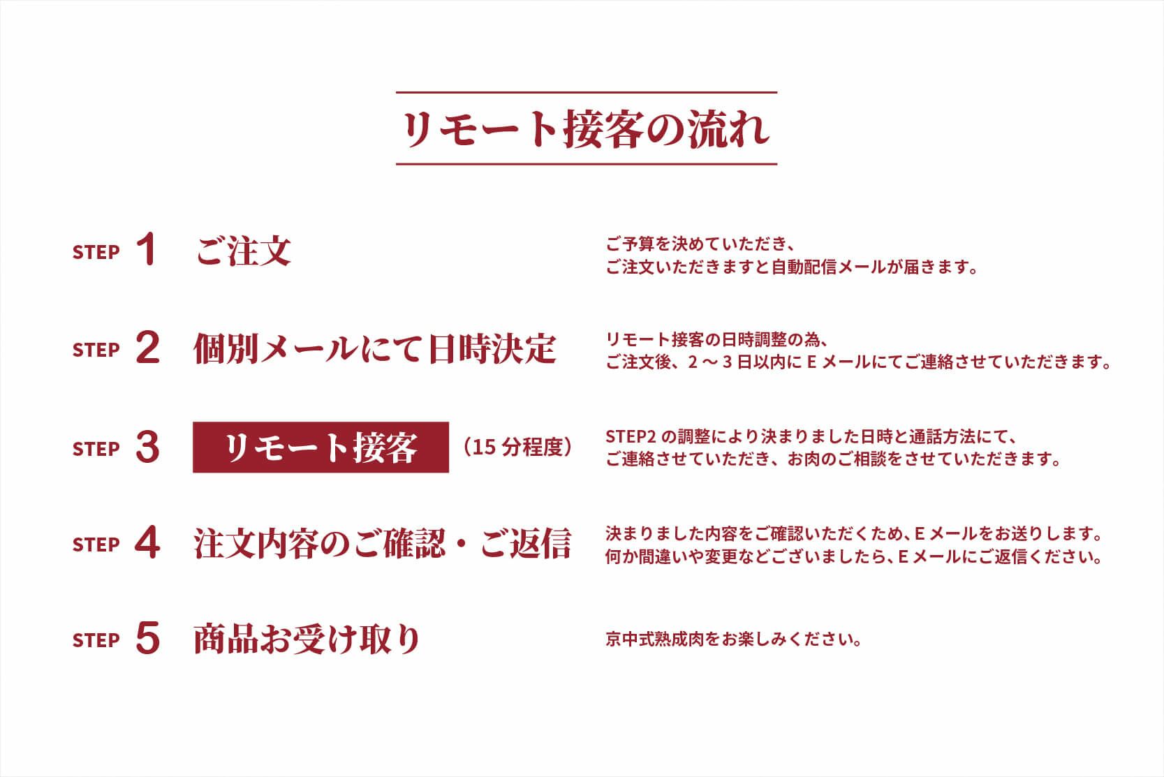 おすすめの食べ方については、リモート接客時にお伝えいたします。 ご注文からお届けの流れ STEP 1 ご注文 予算を決めていただき、ご注文後、自動配信メールが届きます。 STEP 2 個別メールにて日時決定 お電話もしくはテレビ電話をさせていただく日時調整の為、2~3日以内にEメールにてご連絡させていただきます。 STEP 3 リモート接客 調整により決まりました日時と通話方法にて、ご連絡させていただき、お肉のご相談をさせていただきます。 赤身や霜降り、やわらかさなどのお好みはもちろん、複数枚の場合は、1枚1枚の部位や厚さを変えたり、合わせるお塩やしぐれ煮や牛生ハム禄といった前菜についてもご提案させていただきます。 ヒアリングから決定まで、最短10~15分程度かかるかと存じます。 STEP 4 注文内容のご確認・ご返信 決まりました内容をご確認いただくため、Eメールを送ります。何か間違いや変更などございましたら、Eメールにご返信ください。 STEP 5 商品お受け取り 京中式熟成肉をお楽しみください。< ご相談時間が必要なため、ご注文から7日以上の日時にて到着日を指定いただいております。 ご予算とおおよその重量 重量は部位の組合わせによって変動します。 1万円:600g~1.2kg、4~8名分 2万円:1.2kg~2.4㎏、8~16名分 3万円:1.8kg~3.6㎏、12~30名分